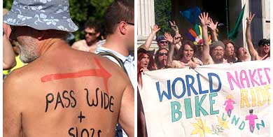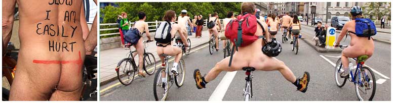 A peaceful, imaginative and fun protest against oil dependency and car culture. A celebration of the bicycle and also a celebration of the power and individuality of the human body. A symbol of the vulnerability of the cyclist in traffic. The world's biggest naked protest: 50+ cities and thousands of riders participate worldwide, including around 3,000 in the UK each year.