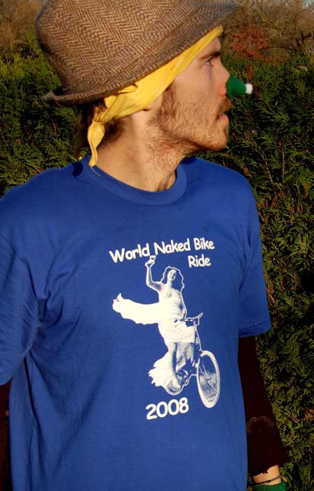 All proceeds go to organizing the 2008 World Naked Bike Ride. T Shirts can be mailed to anywhere in the World. All t shirts come with a free copy of our feature length documentary. Click to watch film trailer